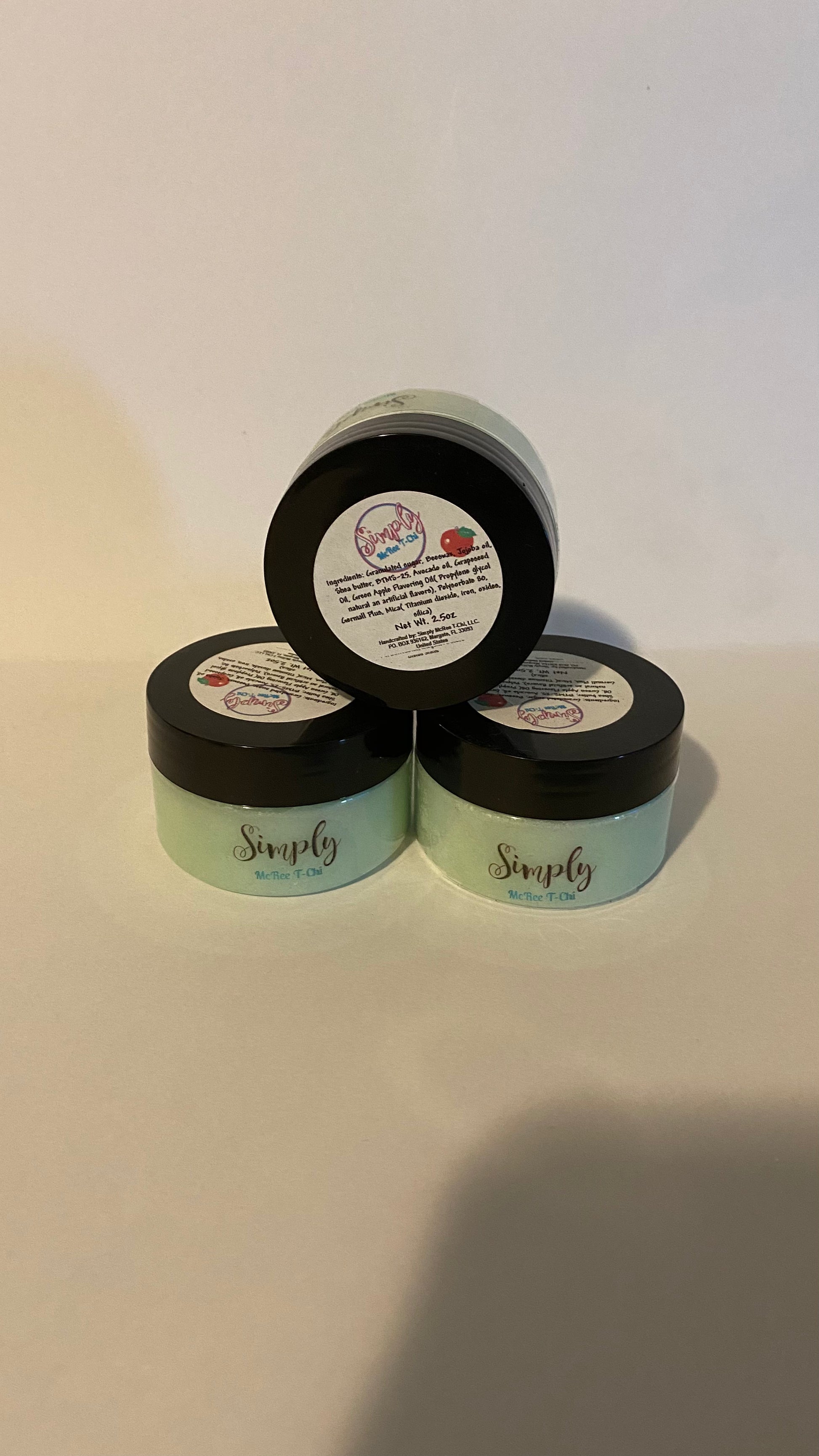 Granulated sugar, Beeswax, Avocado oil, Grapeseed Oil, Mica( Titanium Dioxide, and iron Dixiode Shea Butter, green apple flavoring( Propylene glycol, Artificial flavors Hall and water triacetin red 40, blue 1), Polysorbate 80, Mica(Titanium dioxide, iron, oxides, silica)